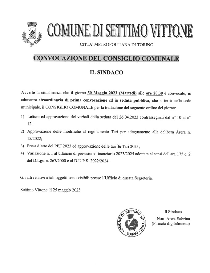 Avverte la cittadinanza che il giorno 30 Maggio 2023 (Martedì) alle 20:30 è convocato in adunanza straordinaria di prima convocazione ed in seduta pubblica, che si terrà nella sede municipale, il CONSIGLIO COMUNALE.