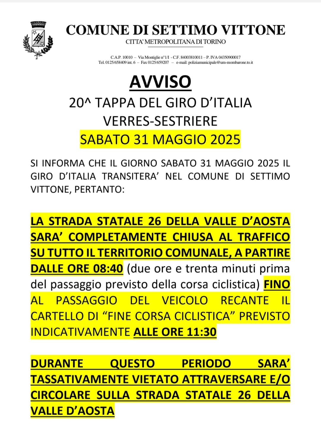 In occasione del passaggio del Giro d'Italia 2025, la Strada Statale 26 verrà chiusa nei giorni 30 maggio (10:45-13:45) e 31 maggio (8:40-11:30).