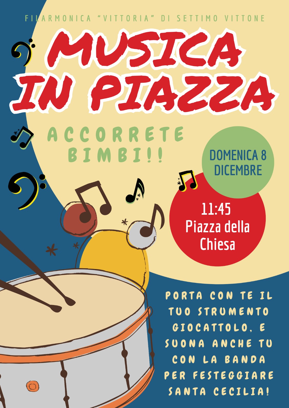 la Filarmonica "Vittoria" invita tutti i bambini a recarsi in Piazza della Chiesa alle 11:45 dell'8 dicembre con i propri strumenti giocattolo per suonare con la banda in occasione dei festeggiamenti di Santa Cecilia.