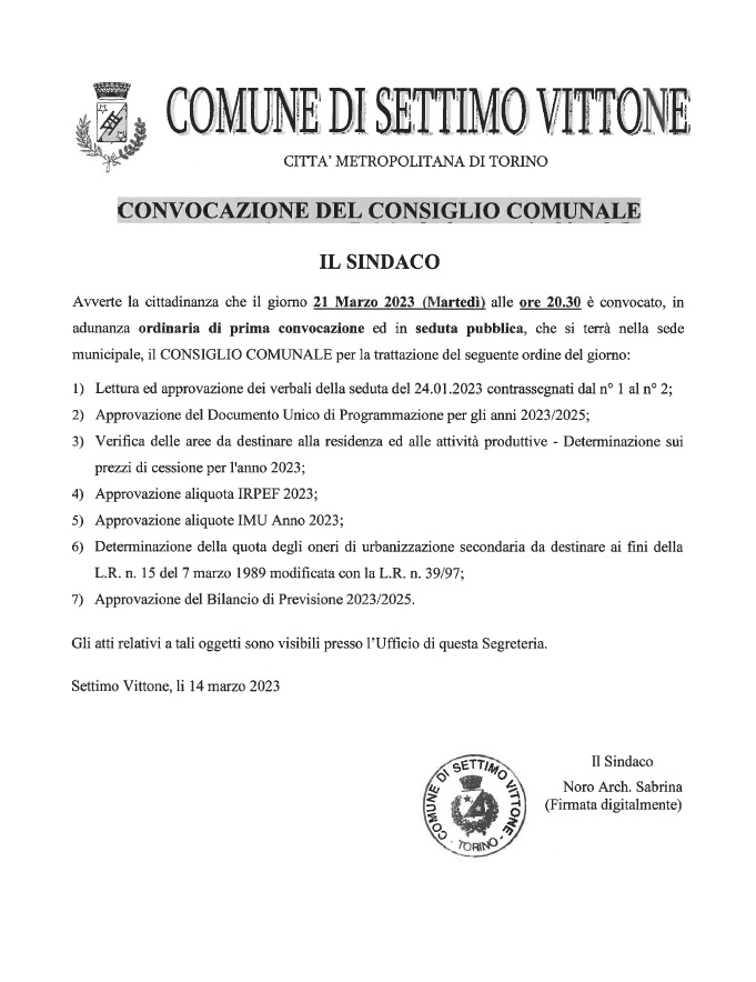 Avverte la cittadinanza che il giorno 15 Marzo 2023 (Martedì) alle 20:30 è convocato in adunanza straordinaria di prima convocazione ed in seduta pubblica, che si terrà nella sede municipale, il CONSIGLIO COMUNALE.