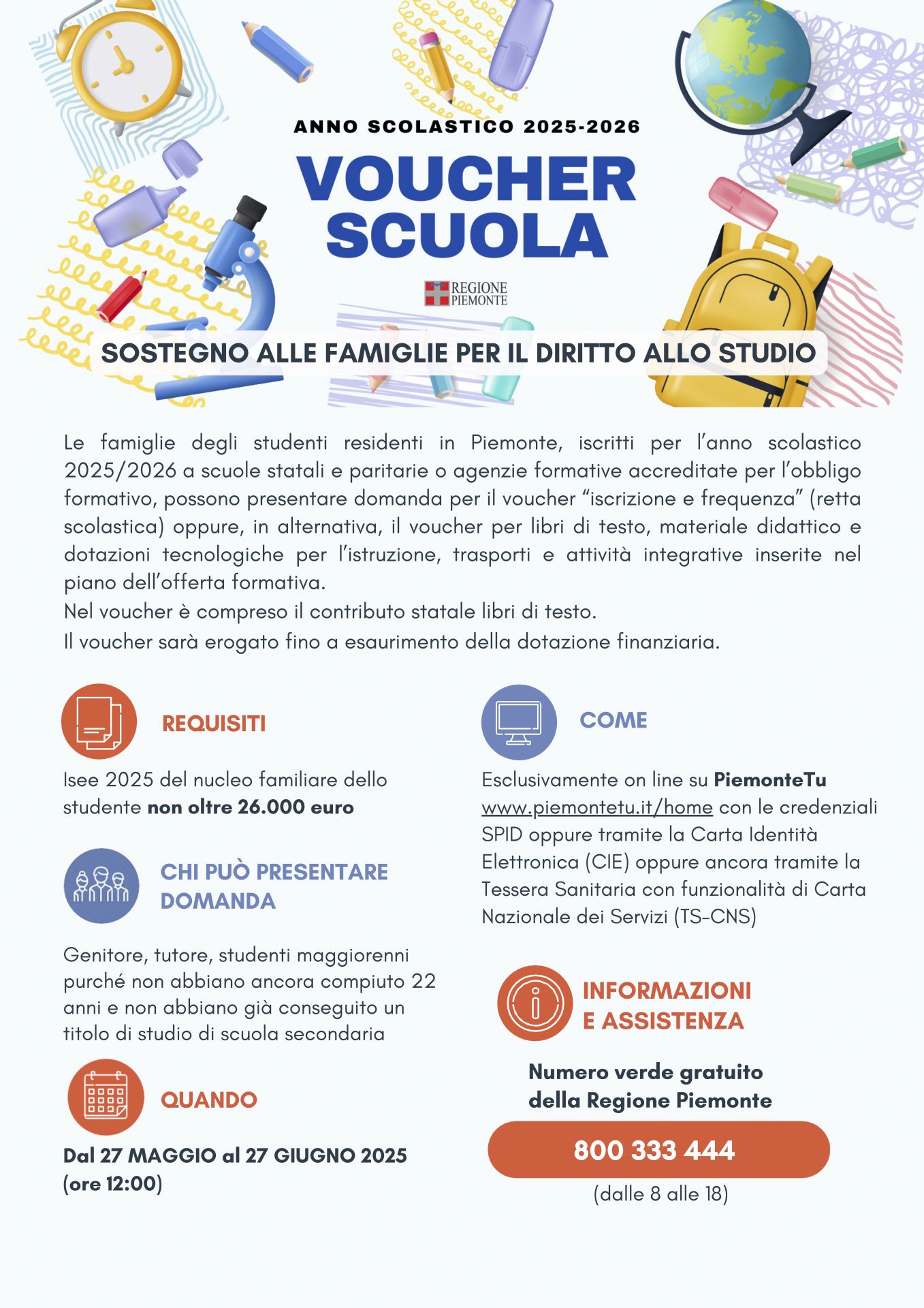 Le famiglie degli studenti residenti in Piemonte, iscritti per l’anno scolastico 2025/2026 a scuole statali e paritarie o agenzie formative accreditate per l’obbligo formativo, possono presentare domanda per il voucher “iscrizione e frequenza” (retta scolastica) oppure, in alternativa, il voucher per libri di testo, materiale didattico e