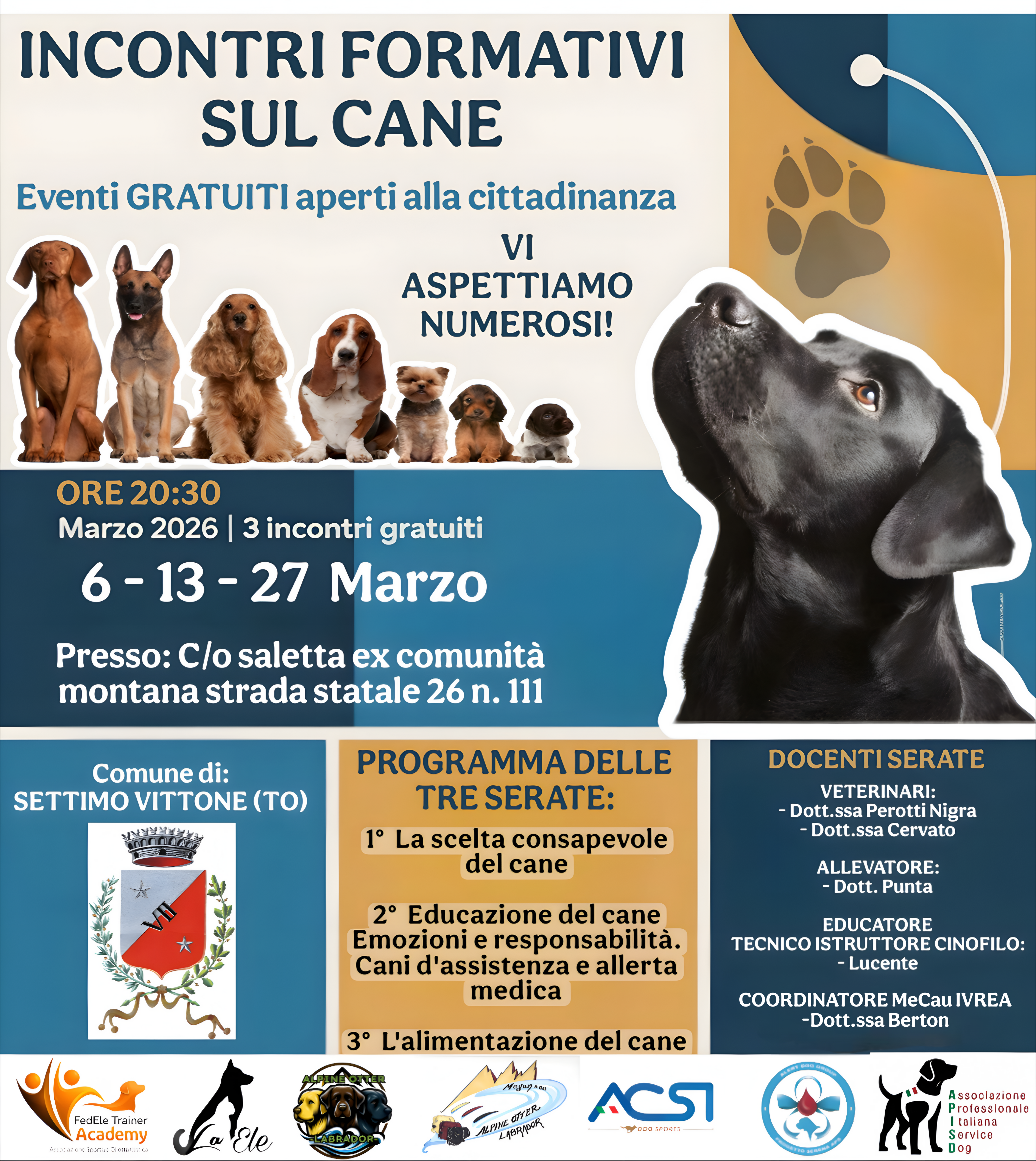 Abbiamo piacere di promuovere un ciclo di tre serate formative gratuite, rivolte a tutti i cittadini, dedicate alla scelta consapevole, all’educazione e al benessere del cane, con l’obiettivo di favorire una convivenza responsabile, inclusiva e rispettosa tra persone e animali.