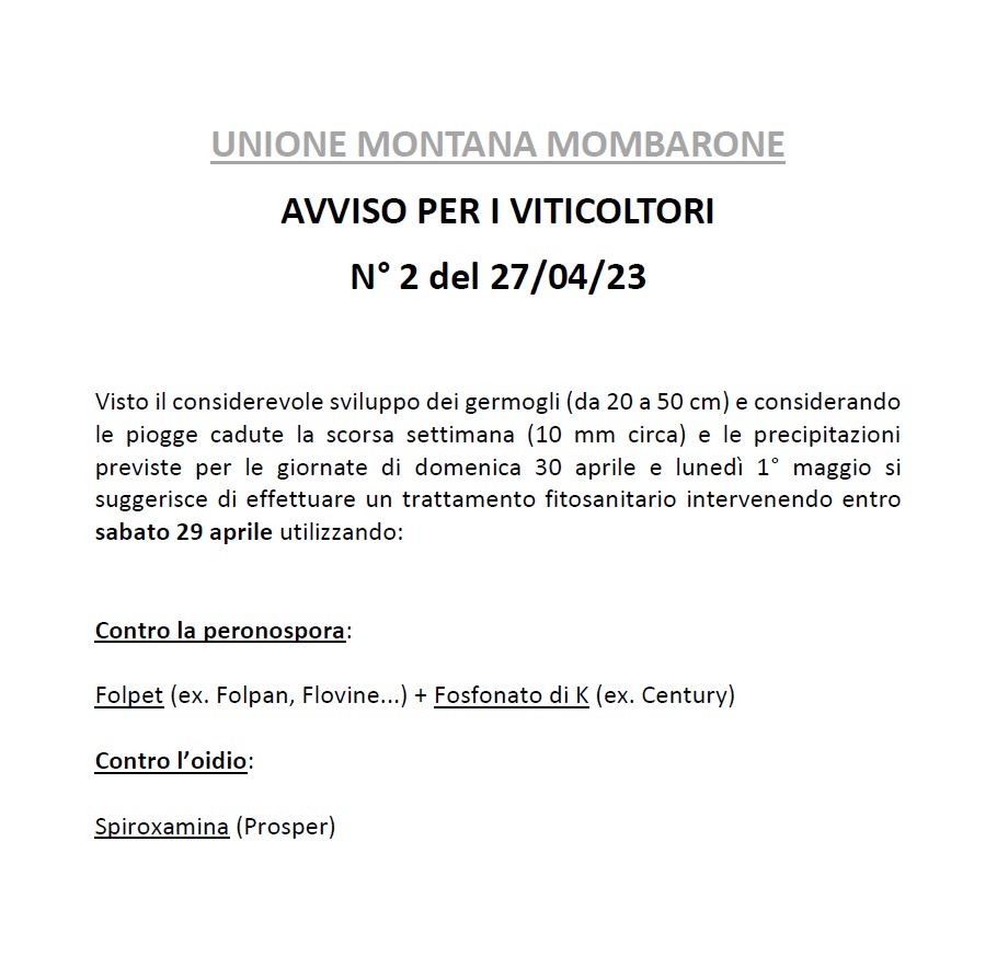 Bollettini per i trattamenti anticrittogamici del vigneto 2023 - Vedi allegati
