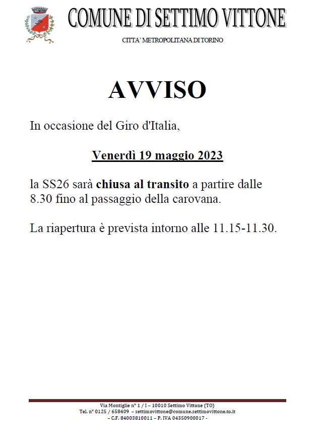 In occasione del Giro d'Italia, Venerdì 19 maggio 2023 la SS26 sarà chiusa al transito a partire dalle 8.30 fino al passaggio della carovana.