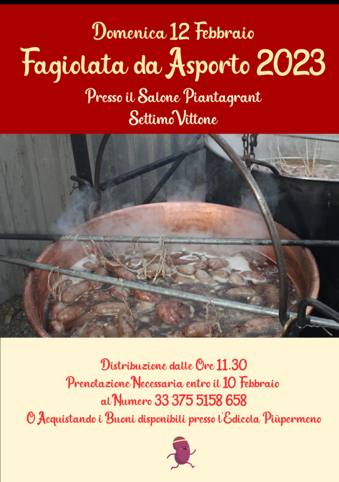 Domenica 12 Febbraio si terrà la Fagiolata da Asporto 2023 presso il salone Piantagrant a Settimo Vittone.