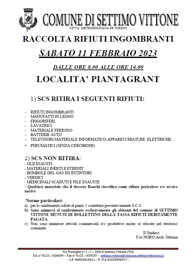 Raccolta rifiuti ingombranti Sabato 11 Febbraio 2023 dalle ore 8:00 alle ore 14:00